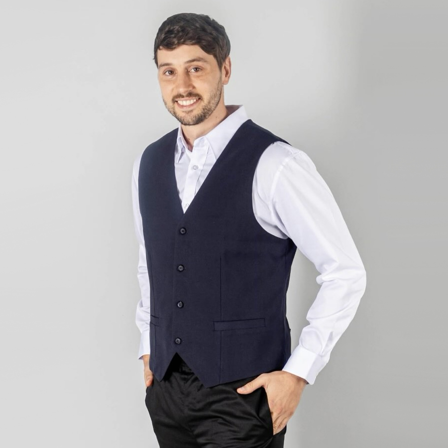 Este es un chaleco ejecutivo de vestir, diseñado para proyectar una imagen profesional, elegante y corporativa. Es una prenda ideal para uniformes de oficina, personal de hotelería o eventos formales.